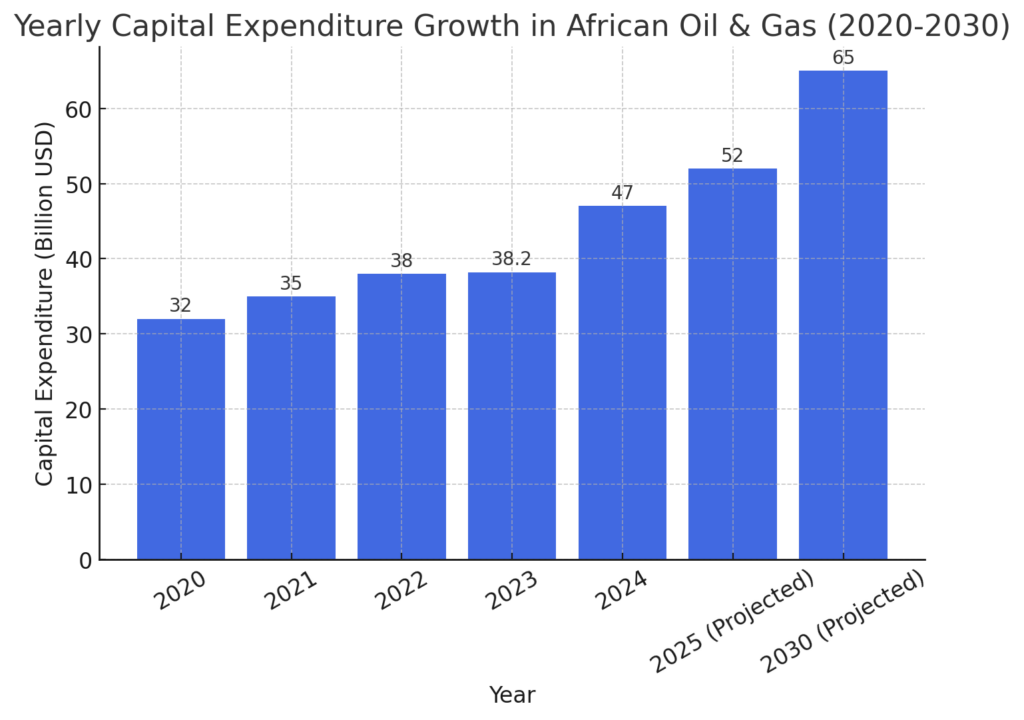 Africa’s energy sector has seen a substantial increase in investment, with capital expenditure (CapEx) reaching $47 billion in 2024, representing a 23% increase from 2023. This report provides a technical analysis of investment trends, emerging players, exploration activity, and future opportunities in Africa’s oil and gas industry.